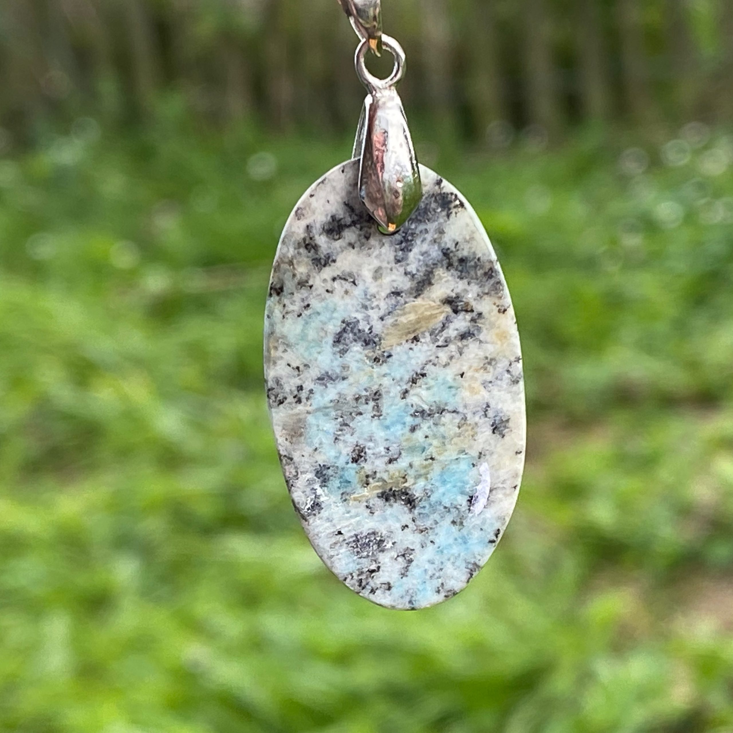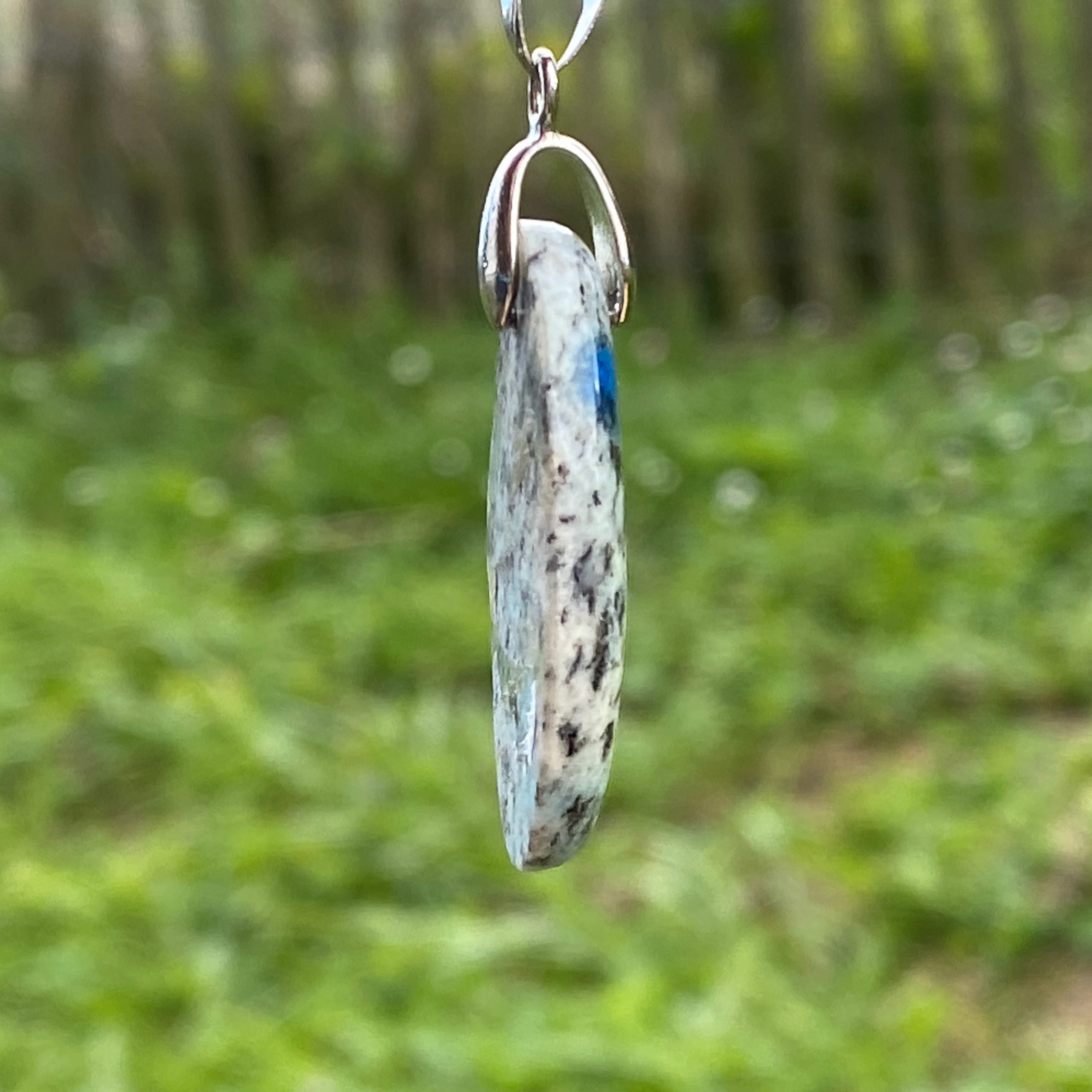 Découvrez ce pendentif K2, une pierre d'exception qui tire son nom du célèbre sommet de l'Himalaya. Ce minéral est composé de granite blanc et d'inclusions d'azurite bleue. C'est un trésor pour les passionnés de lithothérapie.